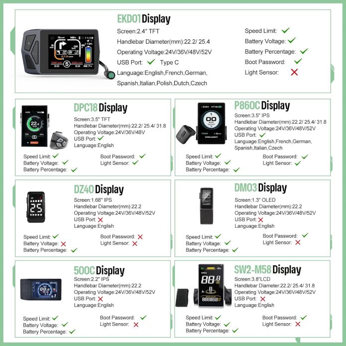 The simpler displays like SW2-M58 provide basic speed, battery level, and PAS info, while more advanced units such as DPC18 or 500C offer richer telemetry like trip data, odometer, and configurable assistance maps. I preferred a mid-range display that offered clear speed and battery readouts without overly complex menus.